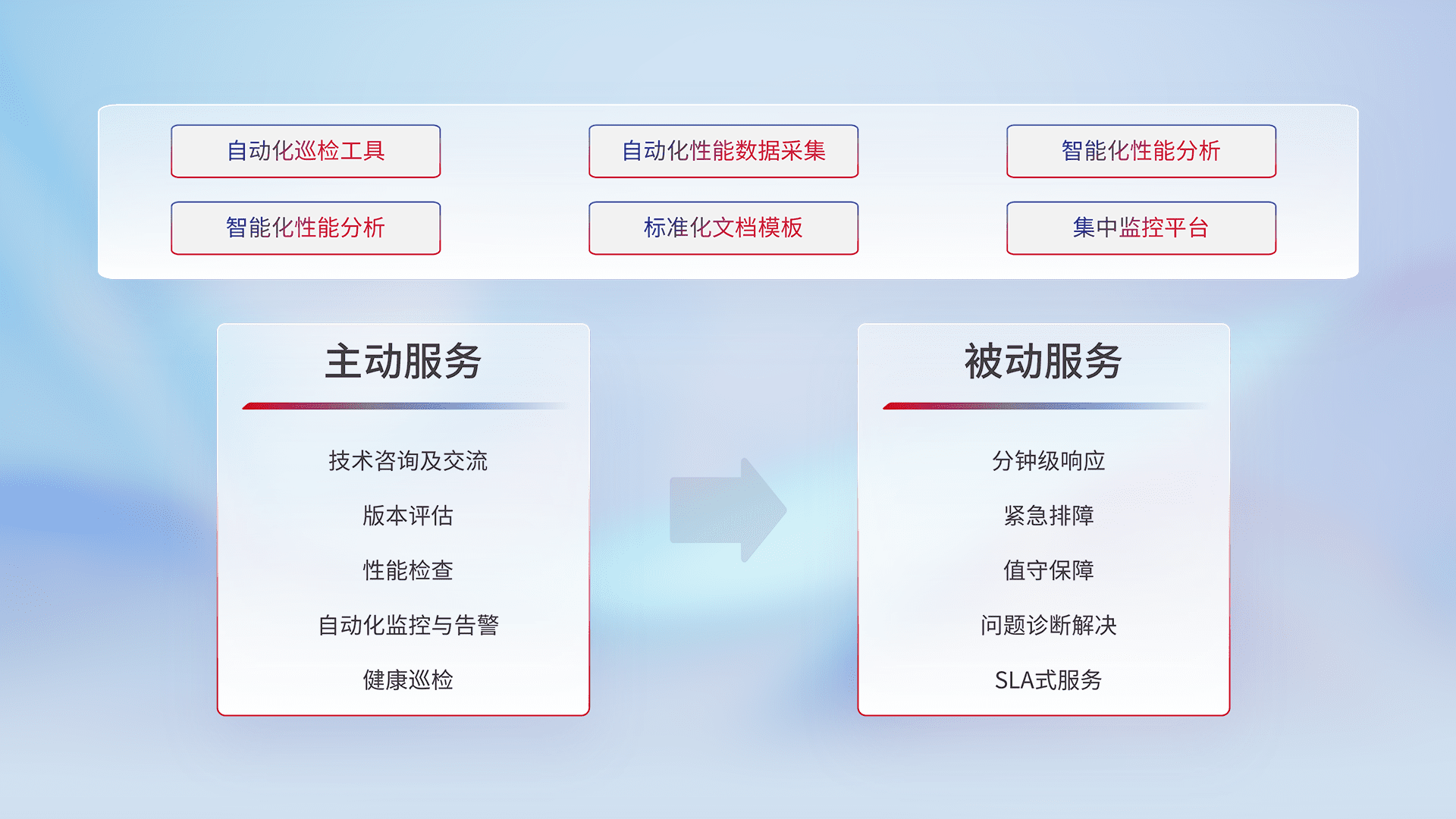 智能化工具和标准化文档,,,,保障服务质量,,,提供主动服务(包含技术咨询、、版本评估、、性能检查、、、自动化监控与告警、、、、健康巡检)和被动服务包含(分钟级响应、、、、紧急排障、、值守保障、、问题诊断解决、、SLA服务)。。。。